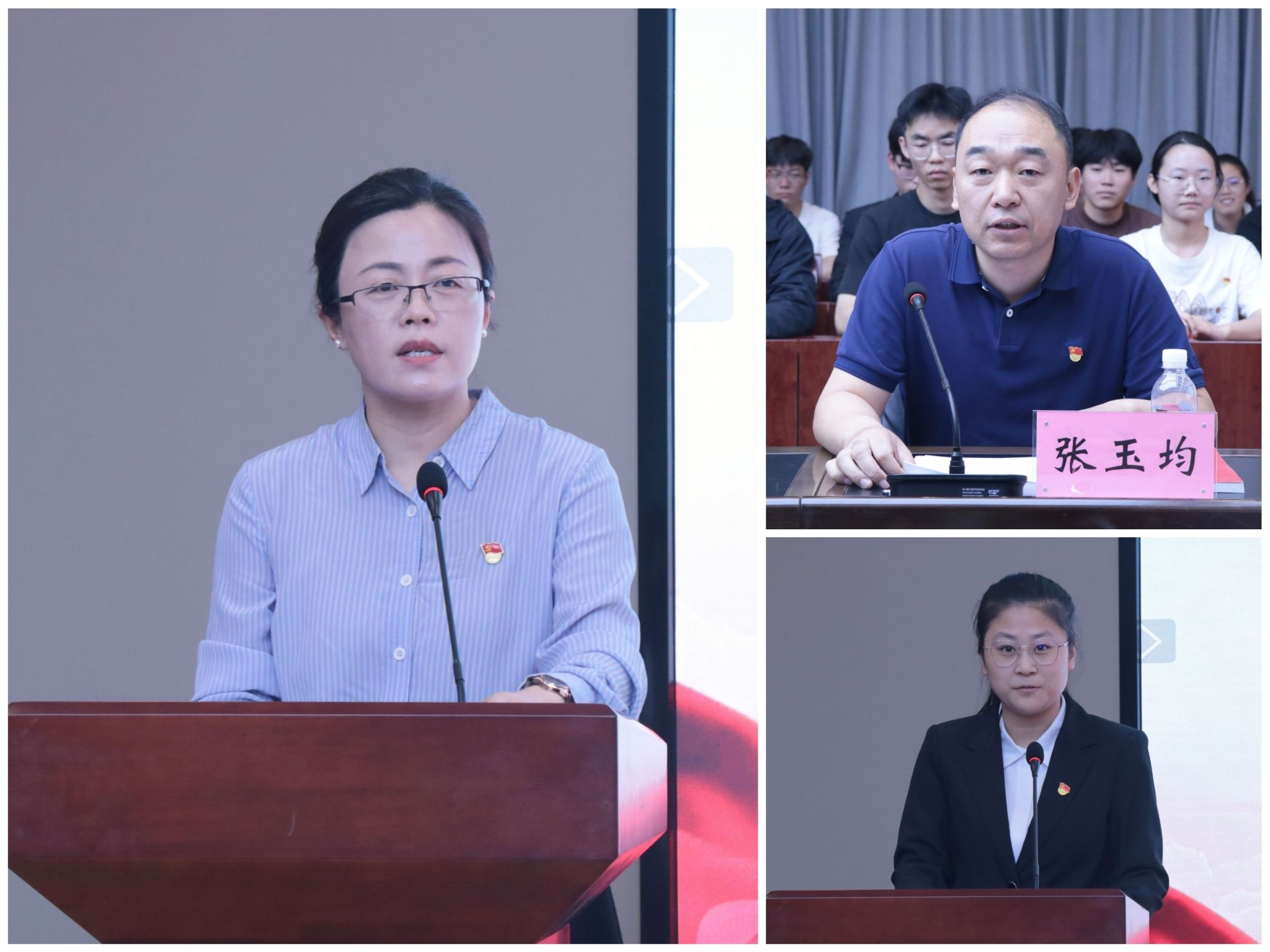 仪式在庄严的国歌声中拉开帷幕。沈立同志宣读了新党员名单,对新党员的加入表示热烈欢迎。在领誓人王程阳的带领下,新党员面向党旗庄严宣誓,老党员重温誓词,表达对党的忠诚和为共产主义事业奋斗终生的坚定决心。随后,老党员代表为新党员代表佩戴党员徽章并赠送《中国共产党章程》,勉励其增强党员身份意识与责任担当。仪式上,教师党员代表张玉均以“三尺讲台守初心”为主题,以自己的入党经历为引,表达了对新党员的希望和鼓励;新党员代表孟成果结合自身经历,分享了思想认识与感悟,表达了恪守誓言、踔厉奋发的坚定信念。