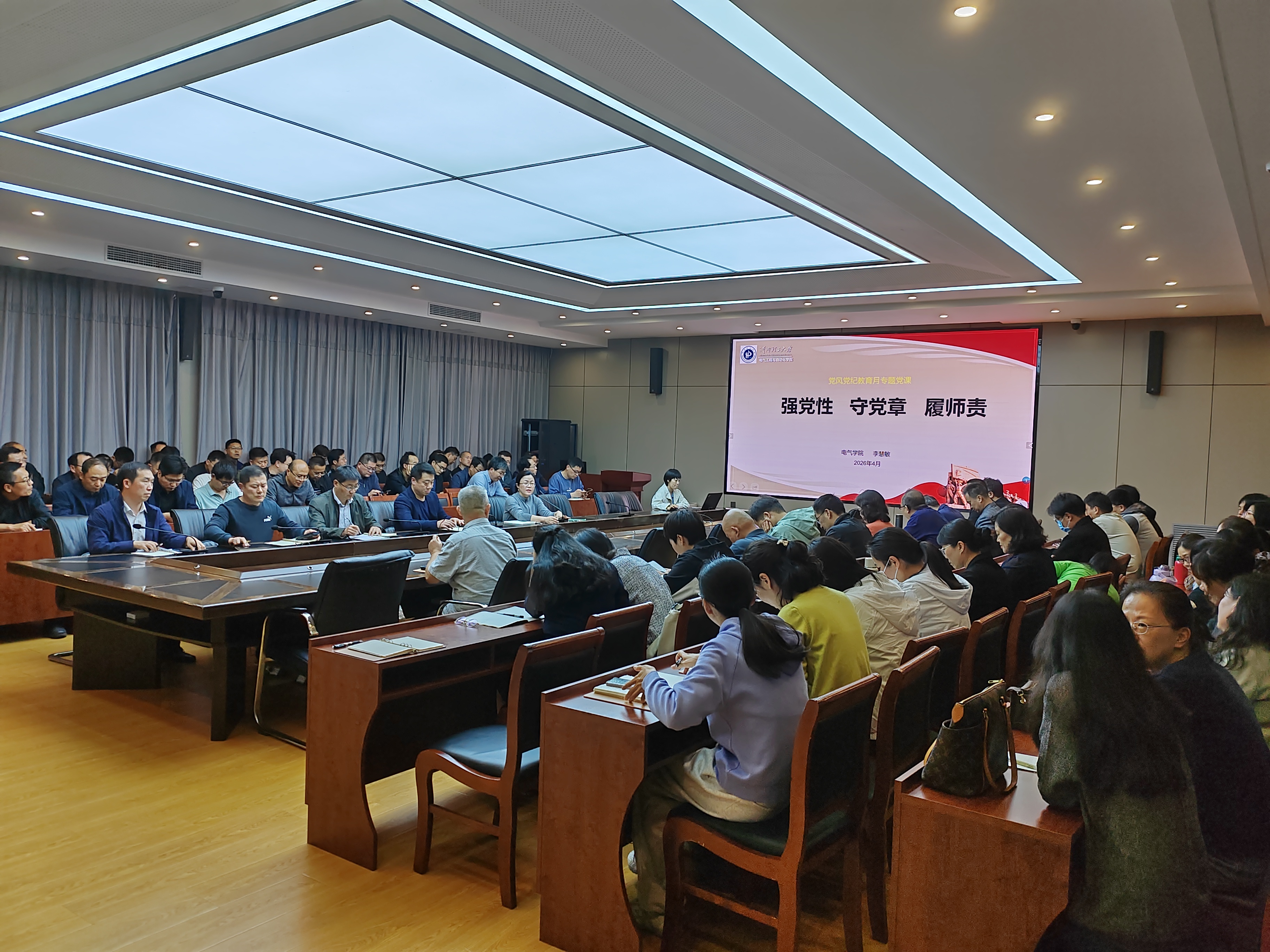 为深入贯彻落实学校《2026年党风党纪教育月活动方案》要求,扎实推进清廉学校建设,4月14日下午,学院在101会议室召开全体教职工大会,党委书记李慧敏以《强党性 守党章 履师责》为题讲授专题党课。