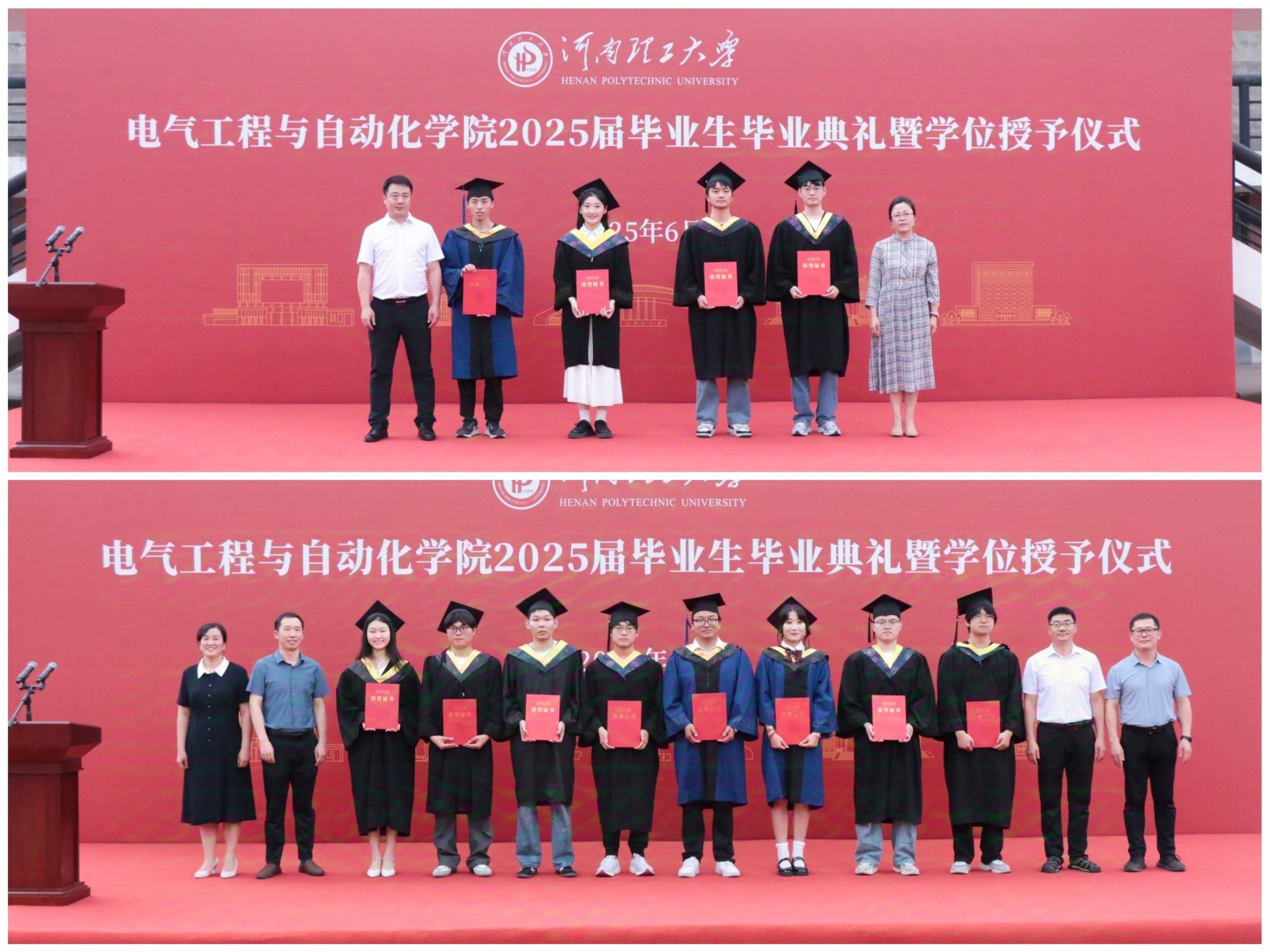 学位授予仪式现场,全场师生起立奏唱校歌。曲毕,学院各学位评定委员会成员为毕业生们逐一拨穗、授予学位证书并合影留念。典礼落下帷幕,但2025届毕业学子们在奋斗征程中永不止步,学院衷心祝愿他们以青春为笔、以奋斗为墨,在人生新篇中书写属于电气人的华彩,无论行至何处,铭记“电气底色”,归来仍是逐梦少年!