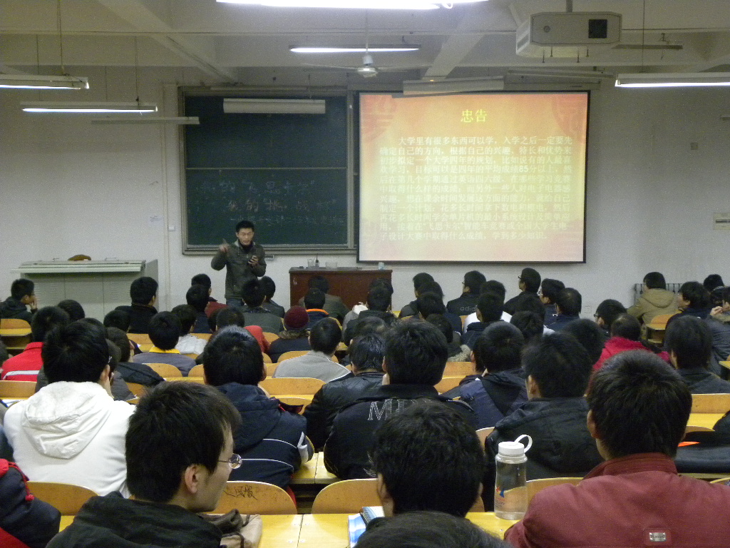 交流会由电器开发部部长马鹏飞主持,在“挑战杯”、“天华杯”竞赛中获得优异成绩的曹书华同学对该比赛进行了相关介绍,并结合自己三年来的大学生活告诫同学们要及早确定自己的目标,并根据自己的兴趣特长和优势及早拟定大学四年规划。在“NEC全国电子设计大赛”“飞思卡尔”“天华杯”竞赛中获得优异成绩的电器开发部成员张正昕同学就学习和科技竞赛等方面与大家进行了广泛的经验交流。