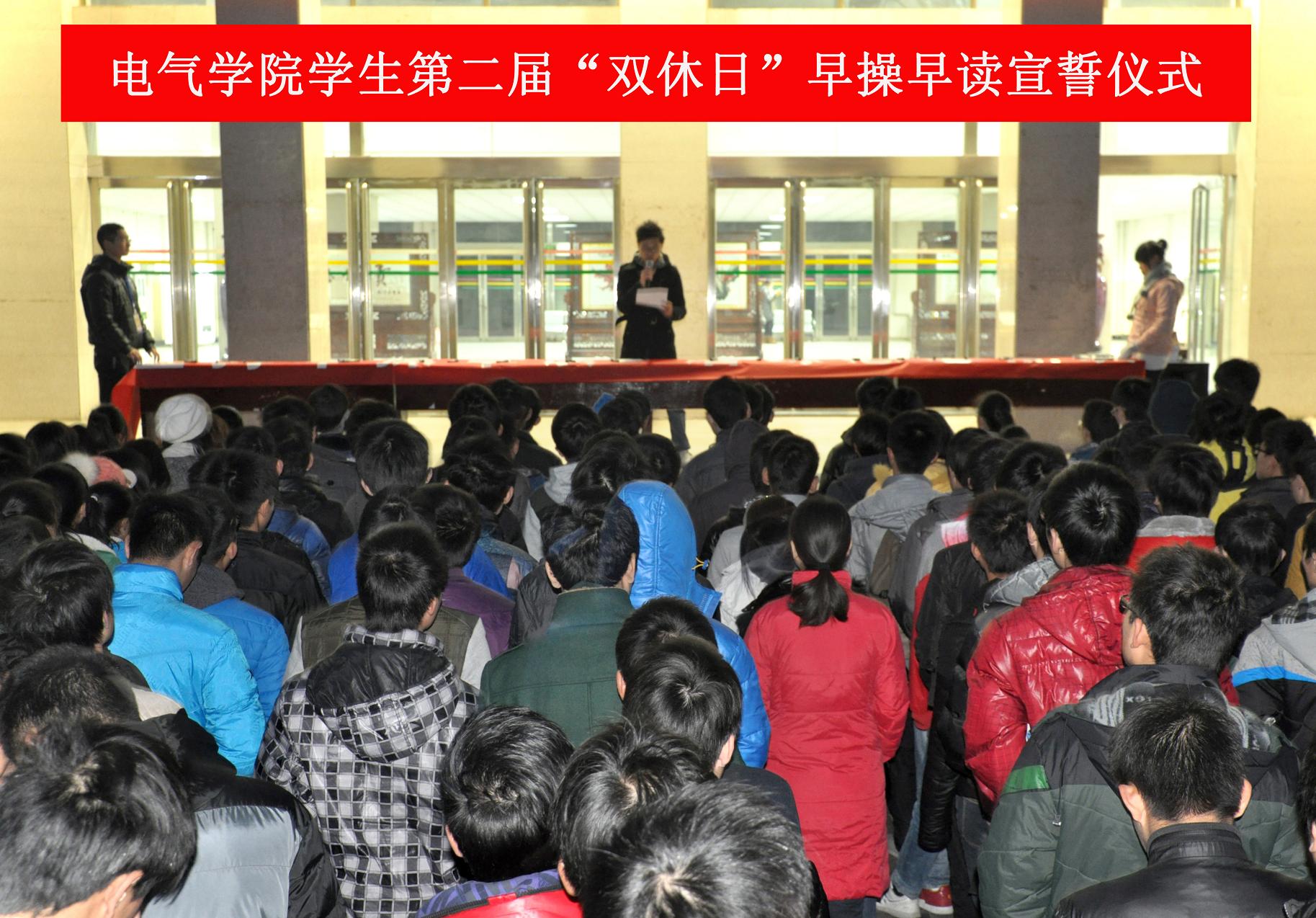 11月30日上午6:30,柠檬导航 2013级学生自发组织的第二届“双休日”早操早读宣誓仪式在三号教学楼前举行。该院2013级459名自愿参加“双休日”早操早读学生参加宣誓仪式。