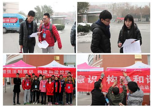 在院党政办的支持和院团委的积极倡导下,11月28日—29日,在学苑餐厅东门,由院宣传中心承办的法制宣传教育活动火热开展。活动现场,宣传中心成员积极主动地向过往同学发放宣传单同时进行法律宣讲。还有同学号召大家在“增强法治意识,构建和谐校园”的条幅上签字来表达自己对此次活动的支持,同时成员们在活动现场诵读国家有关法律法规,向大家宣传法律知识,共同构建和谐校园。
