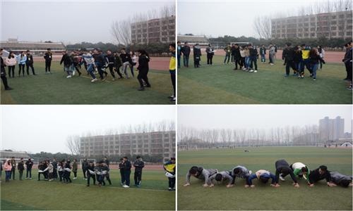 活动开始前,王帅老师简单介绍了本次素质拓展活动开展的意义。在游戏活动环节,各成员被分为五个拓展小组,参加“破冰”、“单脚跑火车”、“四人五足”、“拥挤的公交车”、“盲人摸“象””、“50m接力跑”等比赛。同学们在这样一种“体验式学习”的过程中,不仅增进了彼此间信任感、责任感,而且增强了自信心、沟通能力、领导能力和团队合作能力。虽然天气寒冷,空中还下着淅沥小雨,但现场气氛依旧活跃,充满了欢笑声、呐喊声。