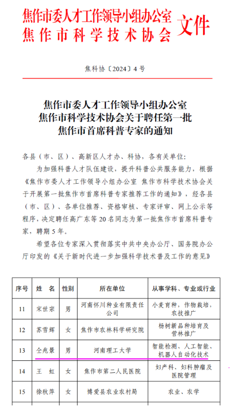 为贯彻落实中共中央办公厅、国务院办公厅印发的《关于新时代进一步加强科学技术普及工作的意见》和焦作市科技创新委员会的《焦作市支持加强科学普及提升全民科学素质的若干政策措施》,壮大科普专家人才队伍,2024年2月28日,焦作市委人才工作领导小组办公室、焦作市科学技术协会发布关于聘任第一批焦作市首席科普专家的通知,柠檬导航 教师仝兆景成功入选。